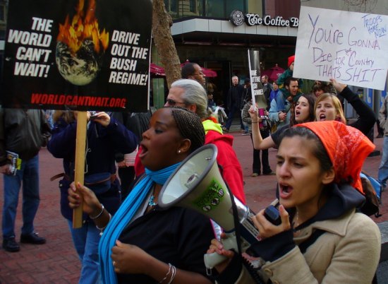 crowd in the chant: “The world can’t wait – drive out the Bush regime!”