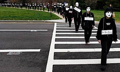 demonstrators dressed in black with white masks to symbolize the Iraqi and