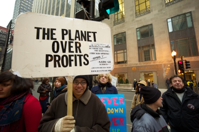 First and foremost: getting out into the public square and protesting is like a muscle that must be exercised in order to remain healthy. There have been other actions in which Occupy Chicago has protested in recent months — like the Bradley Manning protest in December, the January 11 protest against Guantanamo, indefinite detention, and the NDAA, the February 4 protest against U.S. war moves on Iran, and others — but #F28 was all about getting back to Occupy Chicago basics. It felt great to be back at LaSalle and Jackson, and to be marching through the Loop.