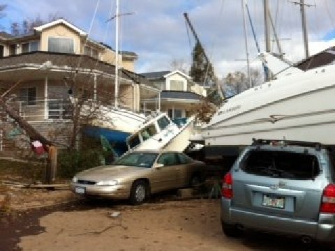 There was a lot of activity at the south beach area, so we kept driving. Lynne saw that people in Great Kills, where boats were strewn about by the hurricane, needed everything. So we turned around and headed to that other beach area, asking people as we drove if they needed anything. Arriving at the “marina” we found police guarding the battered boats, as well as one van of a few National Guard soldiers handing out blankets. There was a guy with a pizza truck feeding people, so we looked for those who called for help via facebook. Finally we spotted a few tables just arranged by about 5 people who had some supplies out. We stopped and unloaded our car. They were so thankful for warm socks, blankets, coats and food. The houses were completed gutted by flooding, and the community was together ripping out the destroyed furniture, as the National Guard drove off.