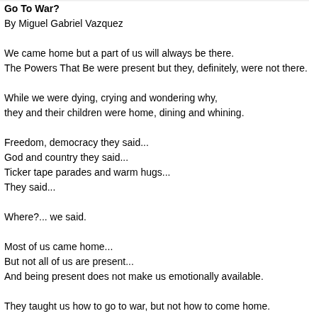 A poem by We Are Not Your Soldiers presenter Miguel Gabriel Vazquez. Read excerpts from his presentation to high school students, My Mexican Heart.