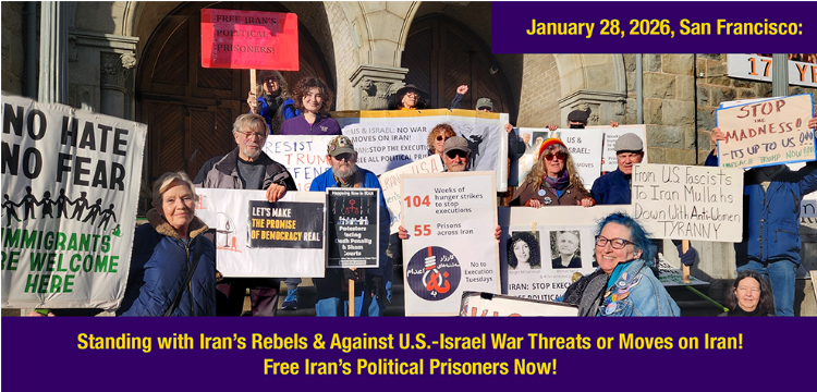 In late December, a powerful uprising broke out in Iran, said to be the largest and most destabilizing uprising in the history of the Islamic Republic of Iran (IRI). The regime responded with a horrific massacre in the streets to crush it, and massive arrests. As January 28 dawned, the massive USS Lincoln and three destroyers arrived in striking distance of Iran, Trump making a gangster-style offer: “MAKE A DEAL… The next attack will be far worse.” These events made the solidarity actions with the radical politics of both supporting the Iranian people AND opposing the U.S./Israeli war moves all the more significant, and at the same time, controversial.