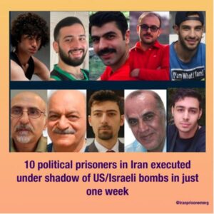At the same time, the Kurdistan Human Rights Network reported that seven Kurdish political prisoners are currently sentenced to death on charges of “waging war against God”, including Pakhshan Azizi, condemned for her humanitarian work in Syria. Four have exhausted their appeals and so are in danger of being executed at any moment. Because the U.S. has expressed hopes to make use of Kurdish forces (including via camps of armed Iranian Kurds in neighboring Iraq), the population of Iranian Kurdistan has suffered the largest number of U.S./Israeli bombardments on targets in the region, as well as heavy repression from the IRI.